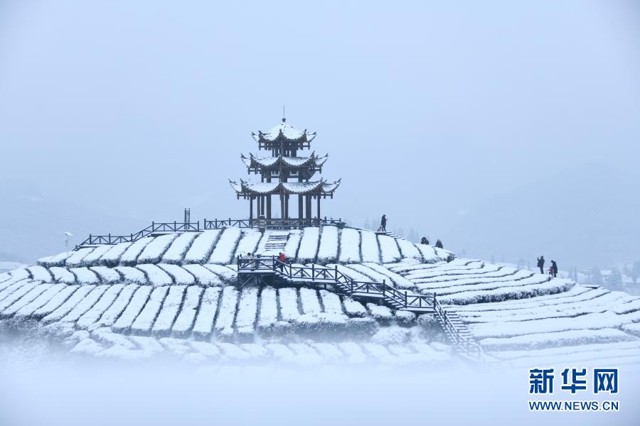 当日,湖北省恩施土家族苗族自治州宣恩县迎来降雪,白雪覆盖的茶园和村庄宛如画卷。