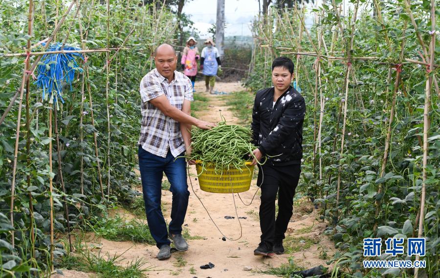 1月7日,在海南省东方市板桥镇田中村常年蔬菜基地,村民将采摘的豇豆搬出农田。