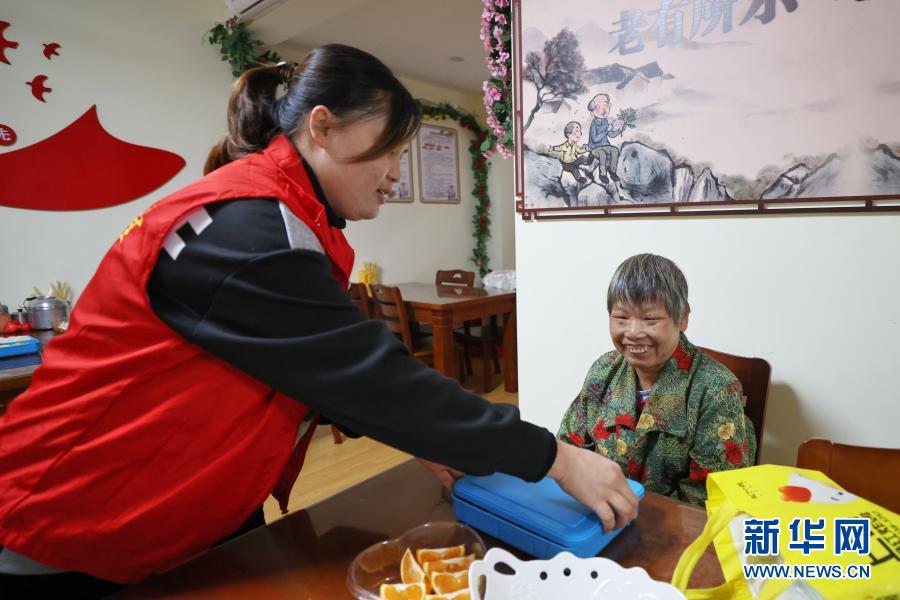 1月7日,海口市盐灶三社区长者饭堂的工作人员吴小静为前来就餐的老人送上饭菜。