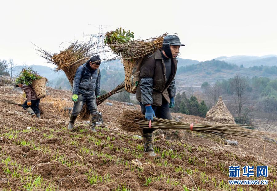 1月7日,村民在贵州省毕节市黔西县甘棠镇仲那村背运苗木上山。