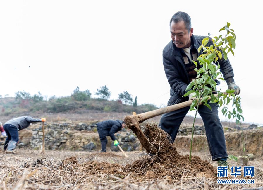 1月7日,村民在贵州省毕节市黔西县甘棠镇仲那村进行苗木栽种。新华社发(范晖 摄)