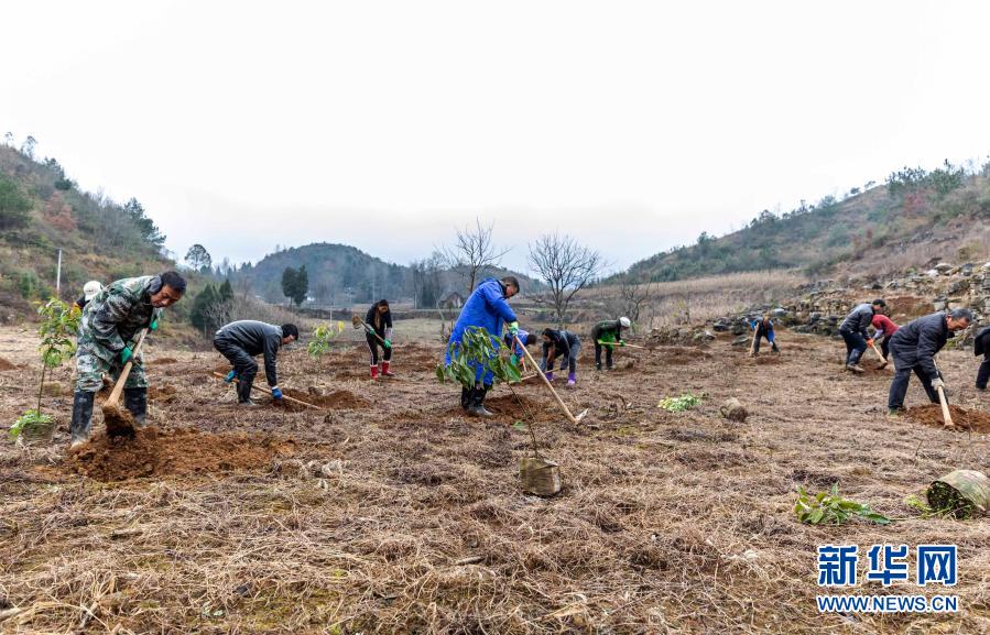 1月7日,村民在贵州省毕节市黔西县甘棠镇仲那村进行苗木栽种。新华社发(范晖 摄)