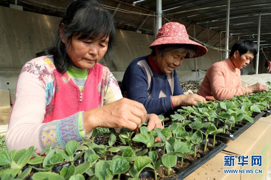 1月13日,安徽省全椒县太平农作物幼苗培育合作社的农民在育苗温棚内嫁接西瓜苗。新华社发(沈果摄)