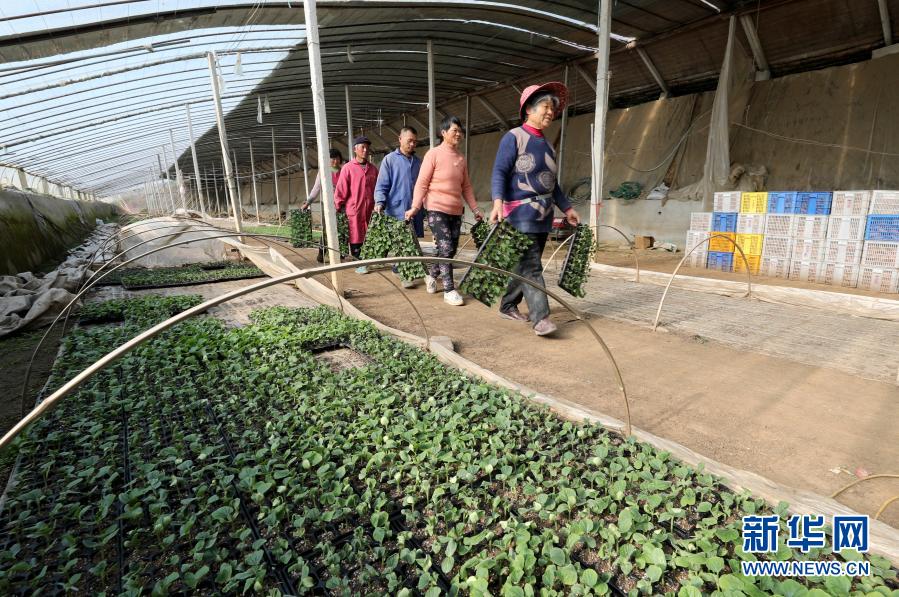 1月13日,安徽省全椒县太平农作物幼苗培育合作社的农民在育苗温棚内搬运秧苗。新华社发(沈果摄)