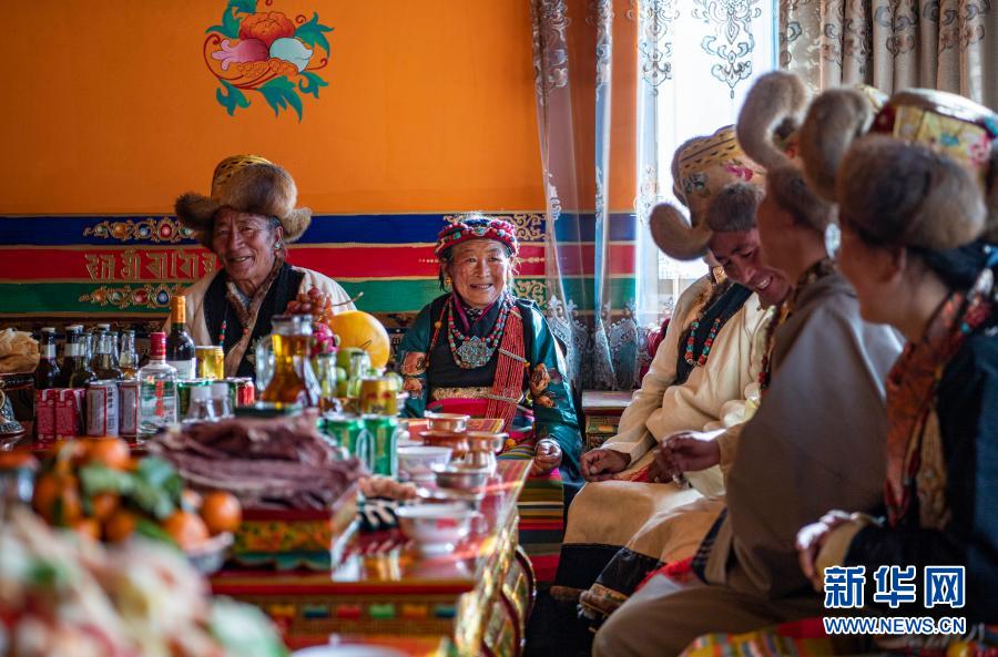 1月14日,在位于嘎吉林村安置点的新家中,村民们身着盛装共度日喀则藏历农家新年。