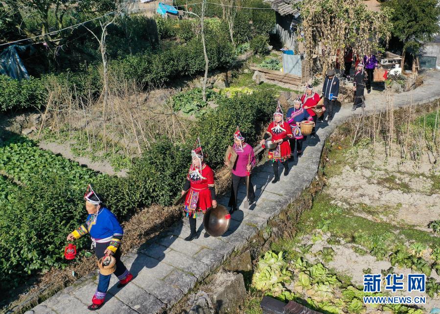 1月18日,在景宁县鹤溪街道周湖自然村,“快乐山歌队”队员边唱山歌边将蓝聪美(前二)家的用具搬到新居(无人机照片)。