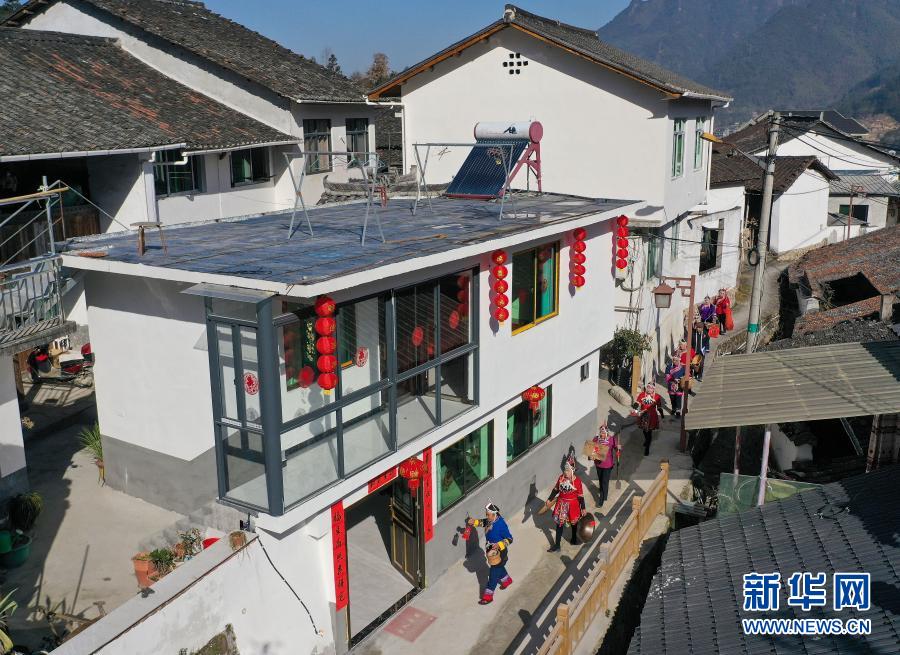 1月18日,在景宁县鹤溪街道周湖自然村,“快乐山歌队”队员边唱山歌边将蓝聪美(前二)家的用具搬到新居(无人机照片)。新华社发(李肃人 摄)