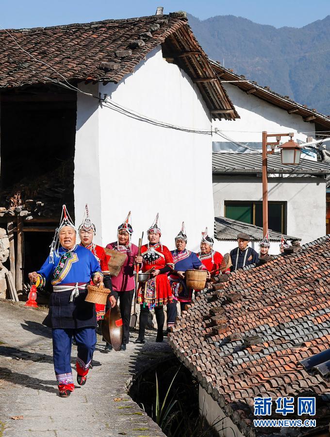 1月18日,在景宁县鹤溪街道周湖自然村,“快乐山歌队”队员边唱山歌边将蓝聪美(前二)家的用具搬到新居。新华社发(李肃人 摄)