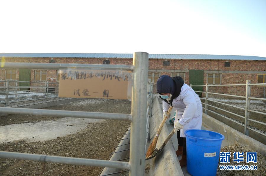 内蒙古农业大学草原与资源环境学院研究生温馨在宁夏吴忠市红寺堡区红寺堡镇城东养殖园区的试验羊舍清理食槽(1月7日摄)。新华社记者 唐如峰 摄