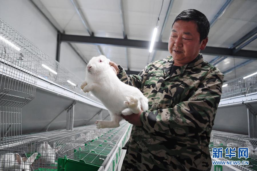 1月19日,技术人员王代红在青岛市帮扶建设的陇南市武都区康大肉兔养殖场内查看肉兔生长情况。