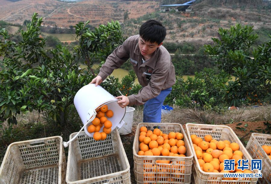 1月26日,村民在上思县那琴乡排柳村红香橙种植基地将刚采摘的红香橙装箱。