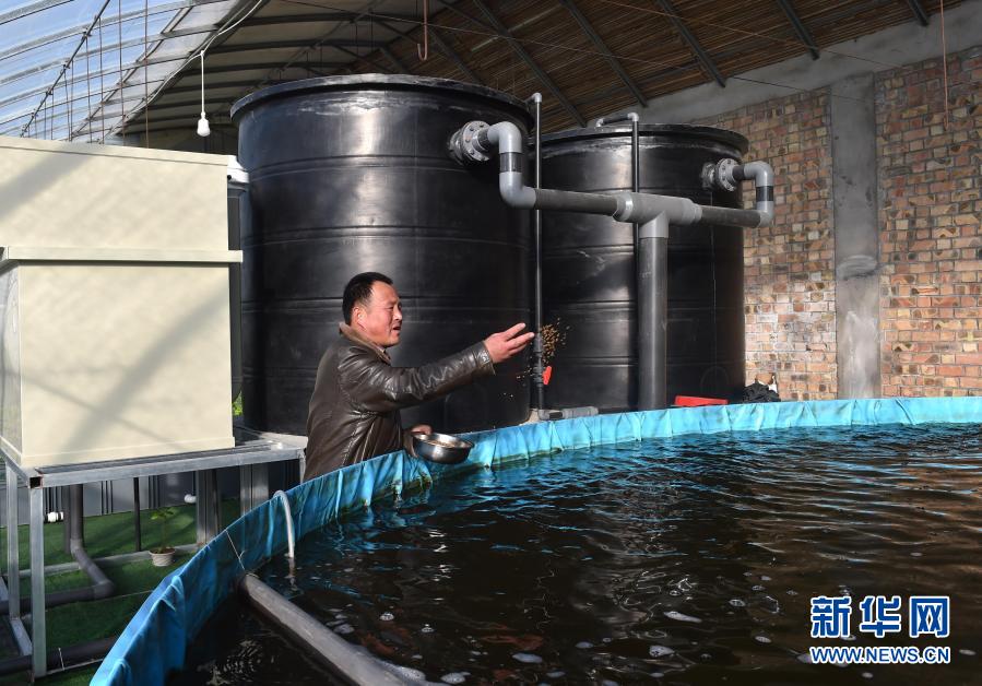 2月2日,在位于固原市彭堡镇姚磨村的一处鱼菜共生大棚,工作人员在投放鱼饲料。
