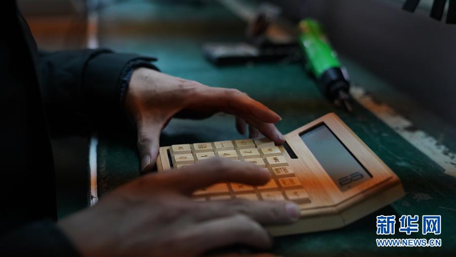 2月26日,铜鼓县奔步科技公司的职工在调试一台竹制计算器。