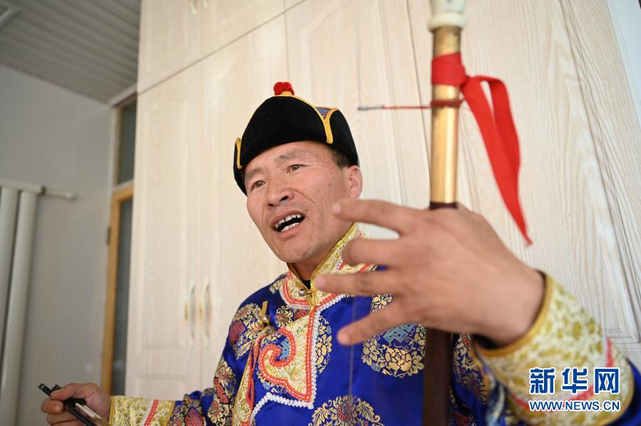 内蒙古自治区通辽市开鲁县脱贫户包莲在表演蒙古族说唱(2月22日摄)。