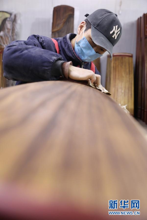 2月28日,在焦作市温县招贤乡太涧村,一家古筝厂的工人在制作古筝。