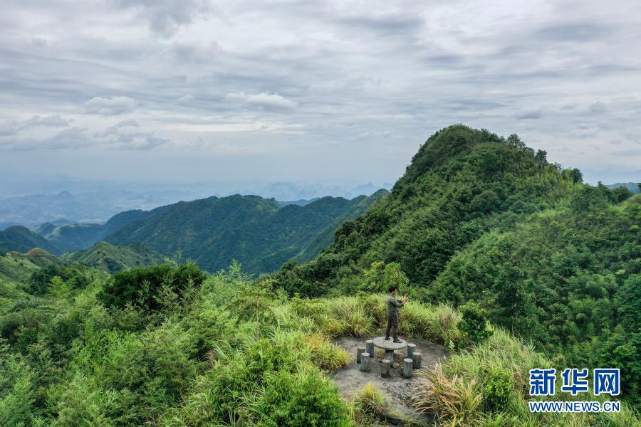 2020年7月9日,在广西大瑶山国家级自然保护区长滩河保护站龙道山护林点工作站,瑶族护林员黄通甫在调试卫星电话,今年48岁的黄通甫已在这个岗位上坚守了14年(无人机照片)。