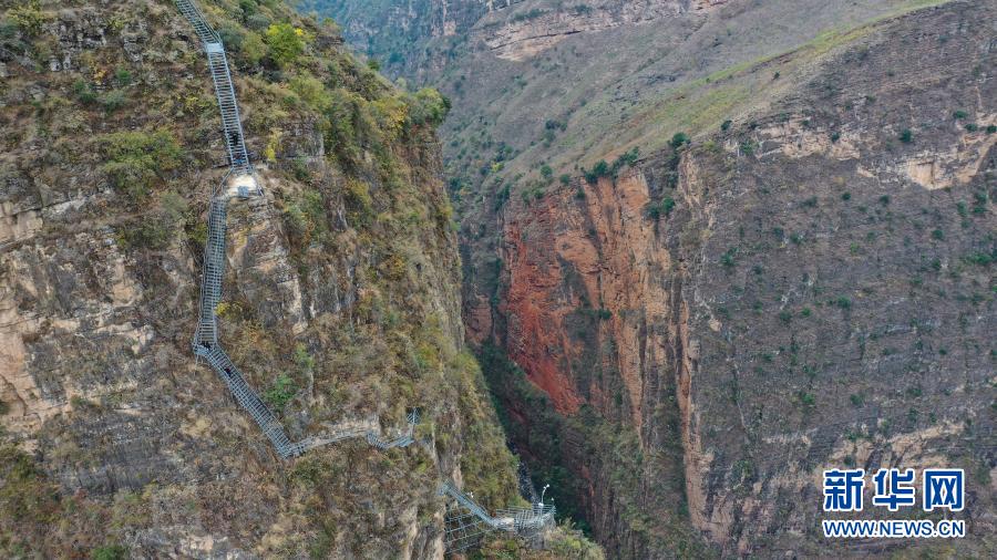 通往四川省凉山彝族自治州昭觉县支尔莫乡阿土列尔村的钢梯一角(2019年11月23日摄,无人机照片)。“悬崖村”是阿土列尔村的别称,从山底到山上村庄海拔落差约800米。2020年5月,阿土列尔村84户建档立卡贫困户344人,陆续搬迁至位于昭觉县易地扶贫搬迁县城集中安置点的新家。