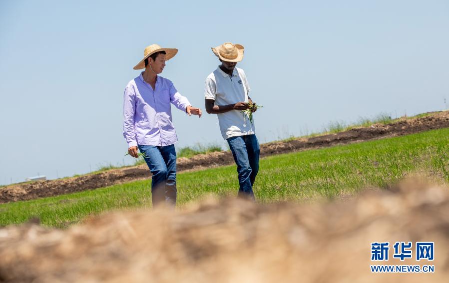 2019年11月28日,在莫桑比克万宝莫桑农业园,中国农业专家(左)和当地农业技术人员巡查水稻田。