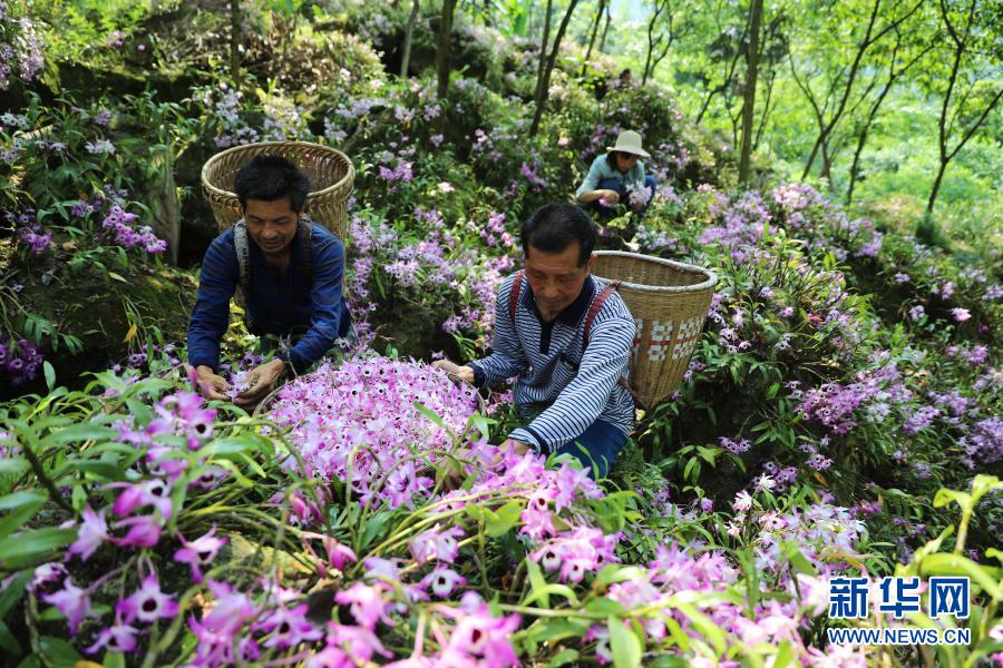贵州省赤水市长期镇五七村村民在采摘金钗石斛鲜花(2020年5月5日摄)。新华社发(王长育 摄)