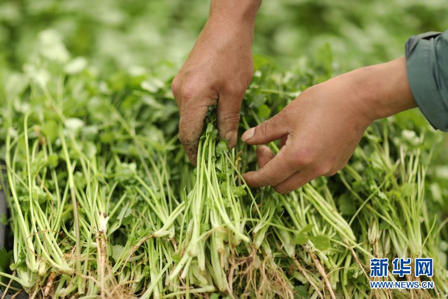 2月27日,村民在贵州省赤水市长期镇共和村大棚内采收香菜。新华社发(王长育 摄)
