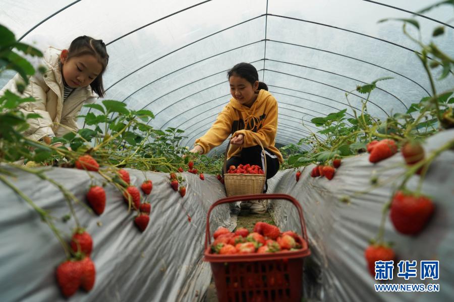 2月27日,游客在贵州省赤水市长沙镇长兴村大棚内采摘草莓。新华社发(张鹏 摄)