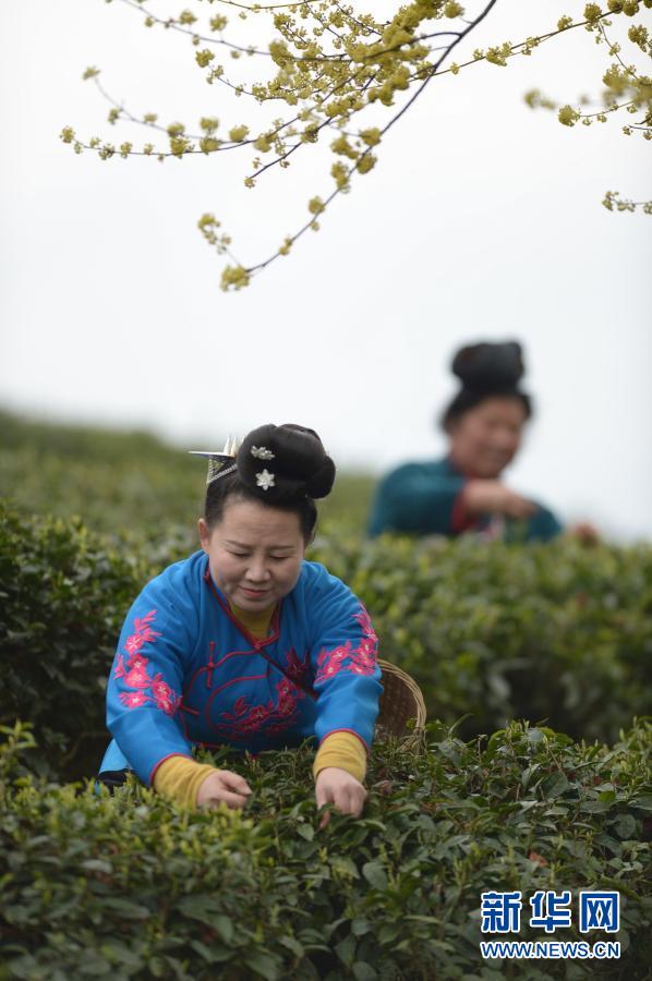 3月2日,茶企员工和村民在贵州省丹寨县龙泉镇马寨村茶园采摘春茶。新华社记者 杨楹 摄