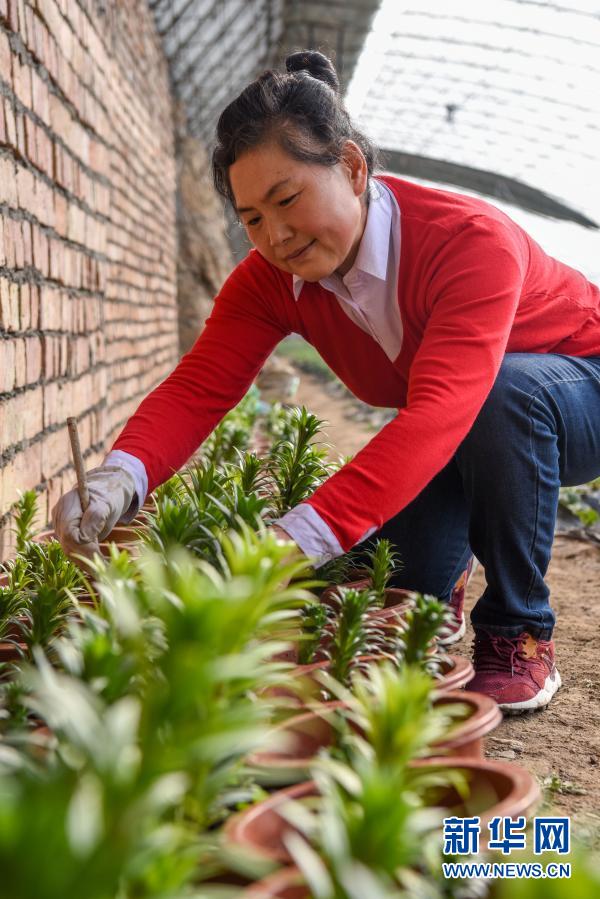 在乌鲁木齐县水西沟镇东湾村,张希英在温室大棚内培育食用百合(3月4日摄)。