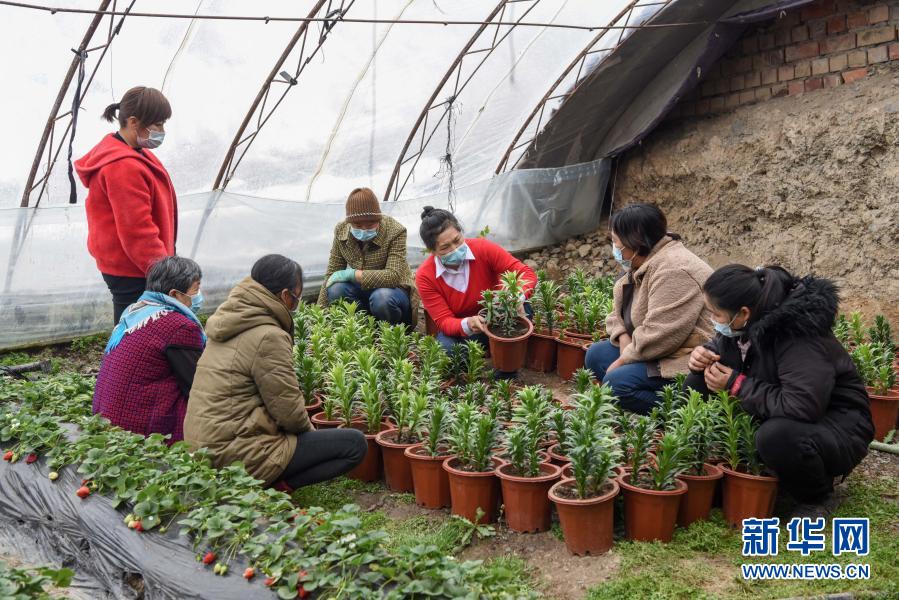 在乌鲁木齐县水西沟镇东湾村,张希英(右三)在温室大棚内为村民传授花卉种植技术(3月4日摄)。