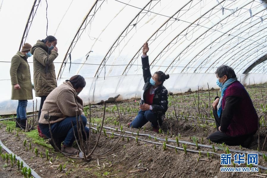 在乌鲁木齐县水西沟镇东湾村,张希英(右二)在温室大棚内为村民传授花卉种植技术(3月4日摄)。
