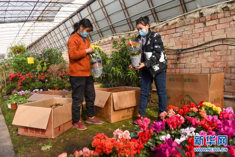 在乌鲁木齐县水西沟镇东湾村的一家花店,张希英(右)帮助店主整理新到的花卉(3月5日摄)。