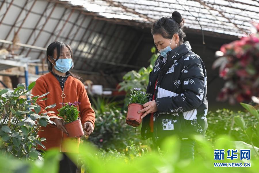 在乌鲁木齐县水西沟镇东湾村,张希英来到村民经营的花店调研花卉销售情况(3月5日摄)。