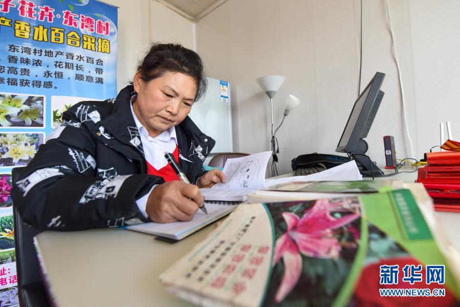 在乌鲁木齐县水西沟镇东湾村,张希英在查阅花卉种植书籍并记录要点(3月5日摄)。