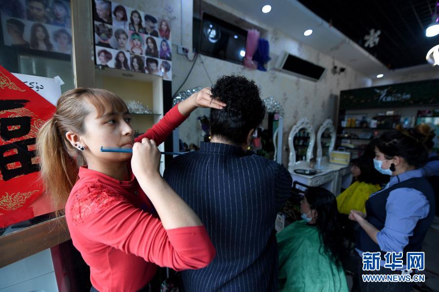 近年来,新疆维吾尔自治区妇联筹集资金,推动南疆四地州约2000个深度贫困村实施“靓发屋”项目全覆盖,并相继在新疆其他地区推广,着力安排农村妇女就地就近就业,实现生活富起来、从“头”美起来。如今已有万余名妇女参加了美容美发技能培训,直接就业妇女约5000人,平均每人每月增收2000元左右。新华社记者 沙达提 摄
