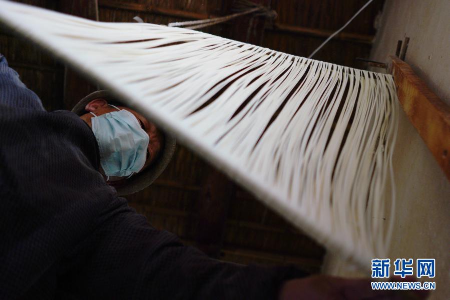 3月10日,河北省新河县望腾村村民侯景涛在制作挂面。