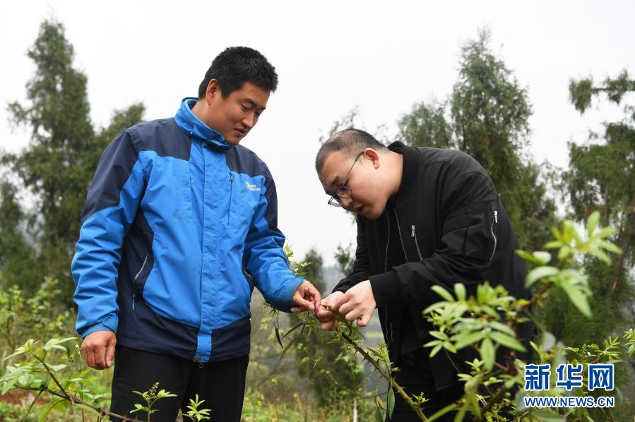 3月10日,重庆市联耕农业发展有限公司技术员张升平(左)和双江镇五里社区第一书记王胤答在花椒种植基地交流种植技术。新华社记者 王全超 摄