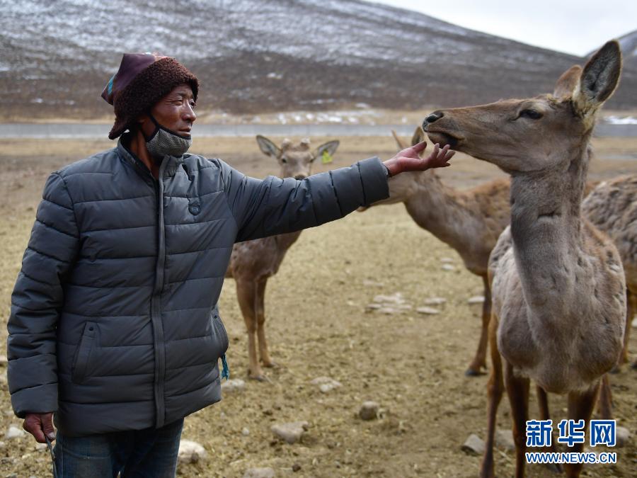 3月13日,甘德县岗龙乡恰不将村生态畜牧业专业合作社村民在鹿场查看。