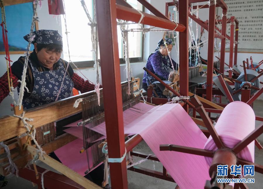 近年来,河北省迁安市杨店子街道办事处高引铺村为促进当地妇女就业创业,采取“公司+合作社+农户”模式,使用传统方法纺织土布,制作床上用品、箱包等手工布艺品,助力乡村振兴。