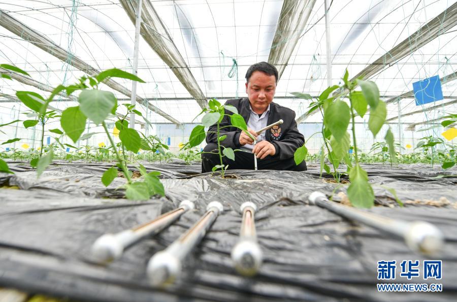 杨胜华在蔬菜大棚里查看土壤温度(3月16日摄)。新华社记者 杨文斌 摄
