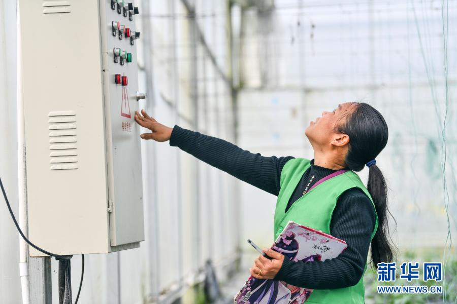 林丽娟在蔬菜大棚里通过电动开关调节温度(3月16日摄)。新华社记者 杨文斌 摄