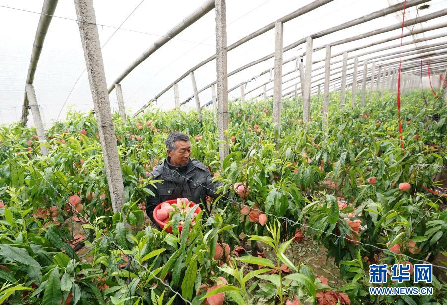 3月18日,乐亭县新寨镇大港村一位农民在自家大棚内采摘鲜桃。