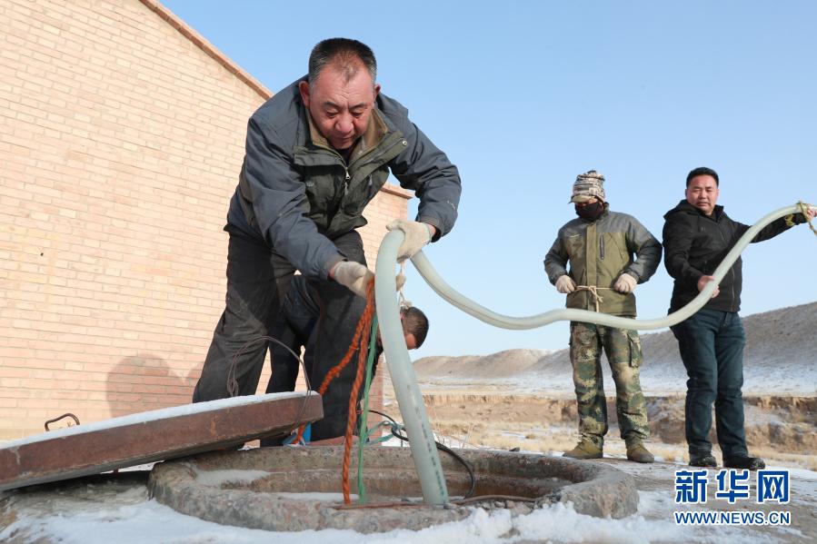 3月20日,顾正礼(左一)和同事在一处供水点安置水泵。新华社记者 杜哲宇 摄