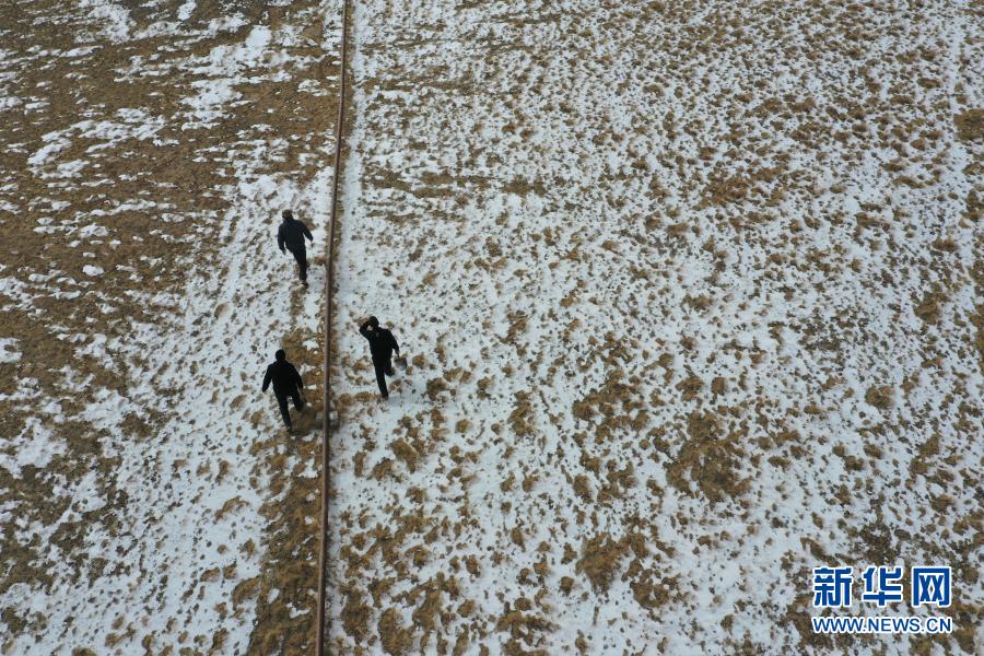 3月20日,顾正礼和同事在巡检管道途中(无人机照片)。新华社记者 杜哲宇 摄
