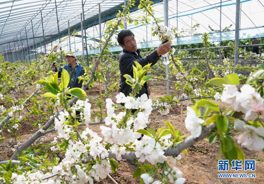 3月21日,秦皇岛市山海关区石河镇石河大樱桃专业合作社社员在大棚内给樱桃树疏花。