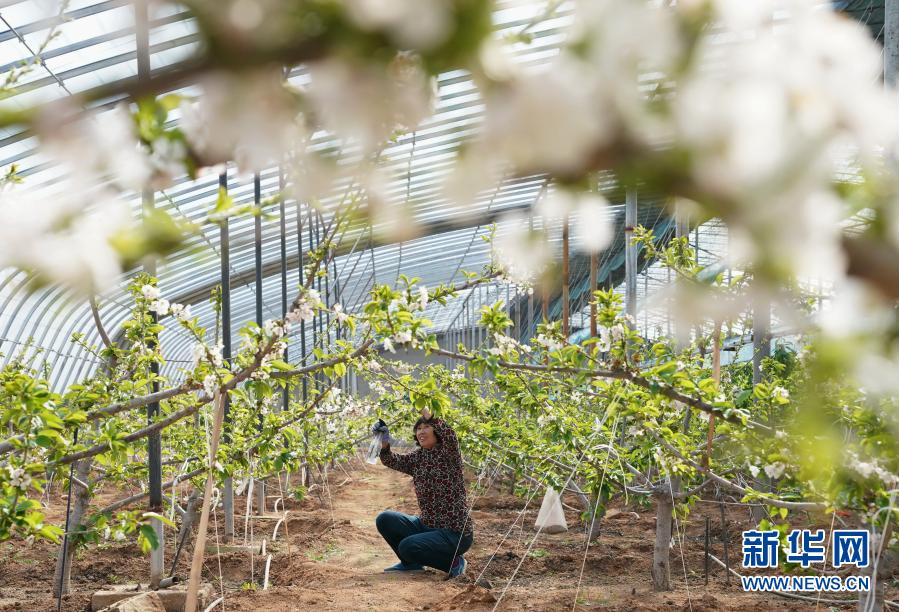 3月21日,秦皇岛市山海关区石河镇石河大樱桃专业合作社社员在大棚内给樱桃树疏花。