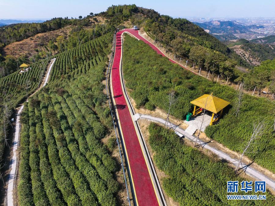 俯瞰慈溪市匡堰镇岗墩村茶园内红色的旅游骑行步道(3月22日摄,无人机照片)。