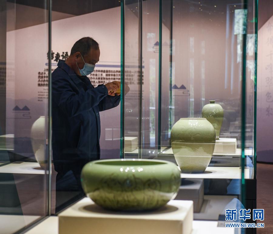 3月22日,游客在位于慈溪市匡堰镇倡隆村的上林湖青瓷文化传承园内的青瓷展厅参观。