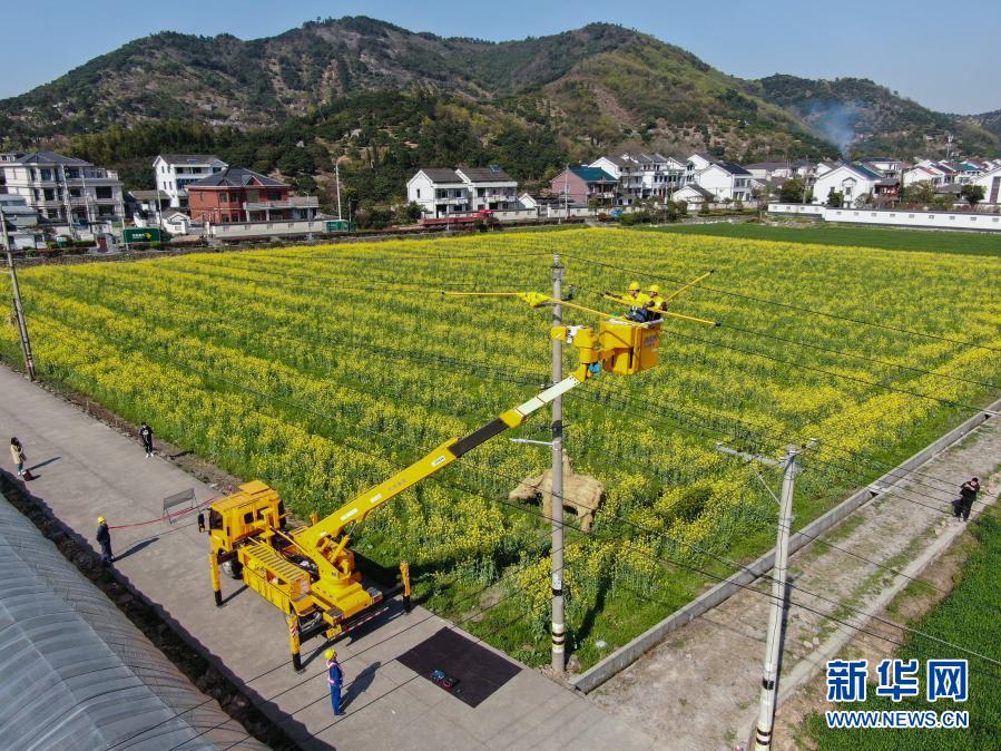 3月22日,慈溪市电力部门对匡堰镇“匡堰花海”景点的线路进行扩容改造,满足乡村旅游的需求(无人机照片)。