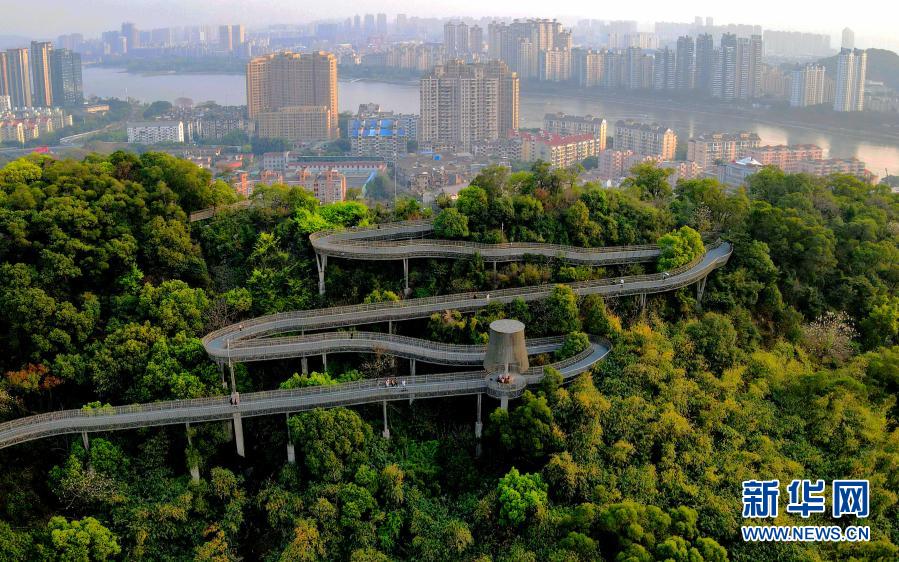 在福州金牛山公园福道拍摄的森林城市景观(2021年3月16日摄,无人机照片)。新华社记者 魏培全 摄
