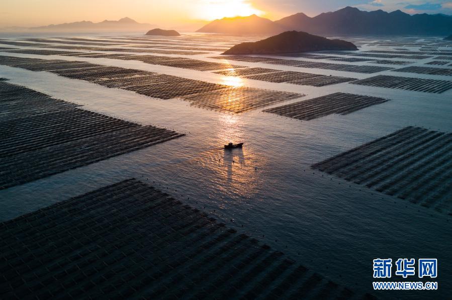 在福建省宁德市霞浦县三沙镇闽东渔场,渔船在夕阳余晖中归港(2020年11月26日摄,无人机照片)。新华社记者 宋为伟 摄