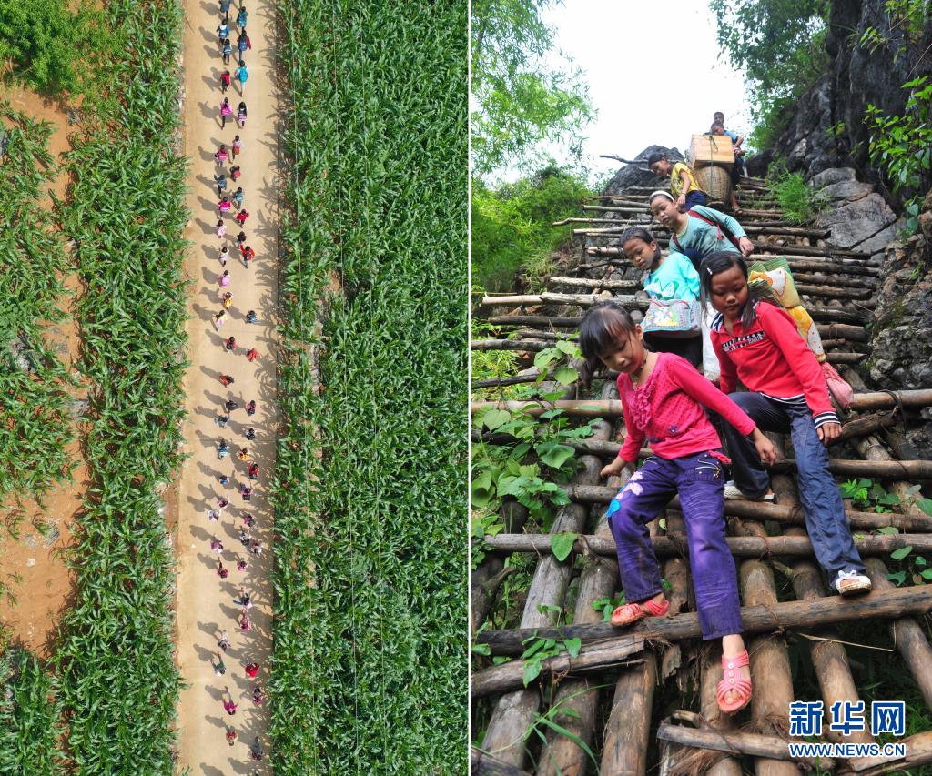 拼版照片:左图为在大化瑶族自治县板升乡弄勇村,孩子们走在放学路上(2019年5月10日摄,无人机照片);右图为在弄勇村弄顶屯,孩子们扛着生活用具,爬悬梯去学校(2012年9月3日摄)。如今弄勇村已基本实现屯屯通公路。